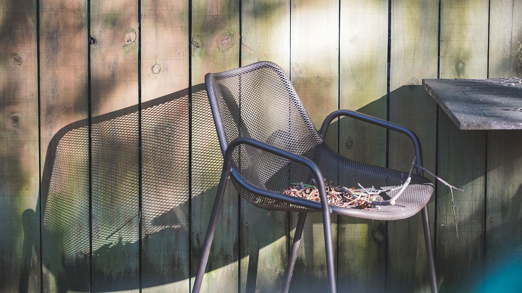 I love how the light in this photo casts the metal chair’s shadow onto the wooden fence.