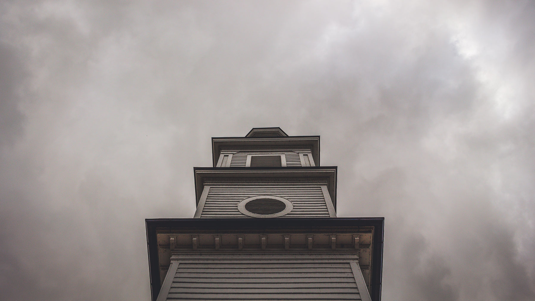 I like how the church steeple shoots up from the bottom of the photo, and into the clouds.