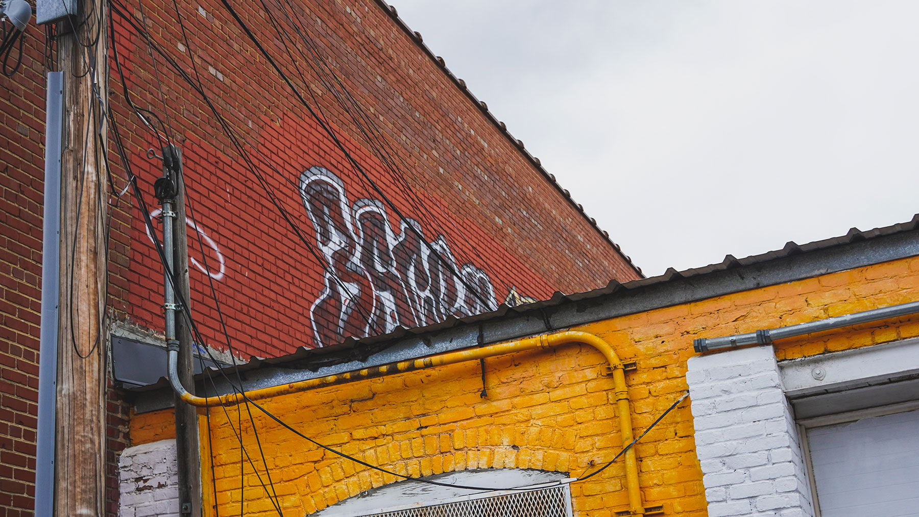 The graffiti caught my eye along with the yellow and orange colors. I looked through camera, and noticed the intersecting roof lines.