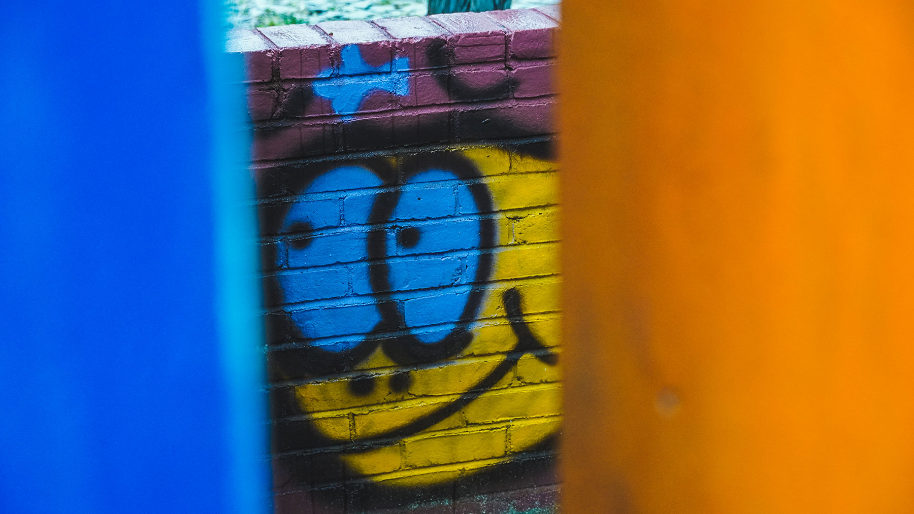 The two pillars on each side make a great frame for the graffiti in the center of the photo.