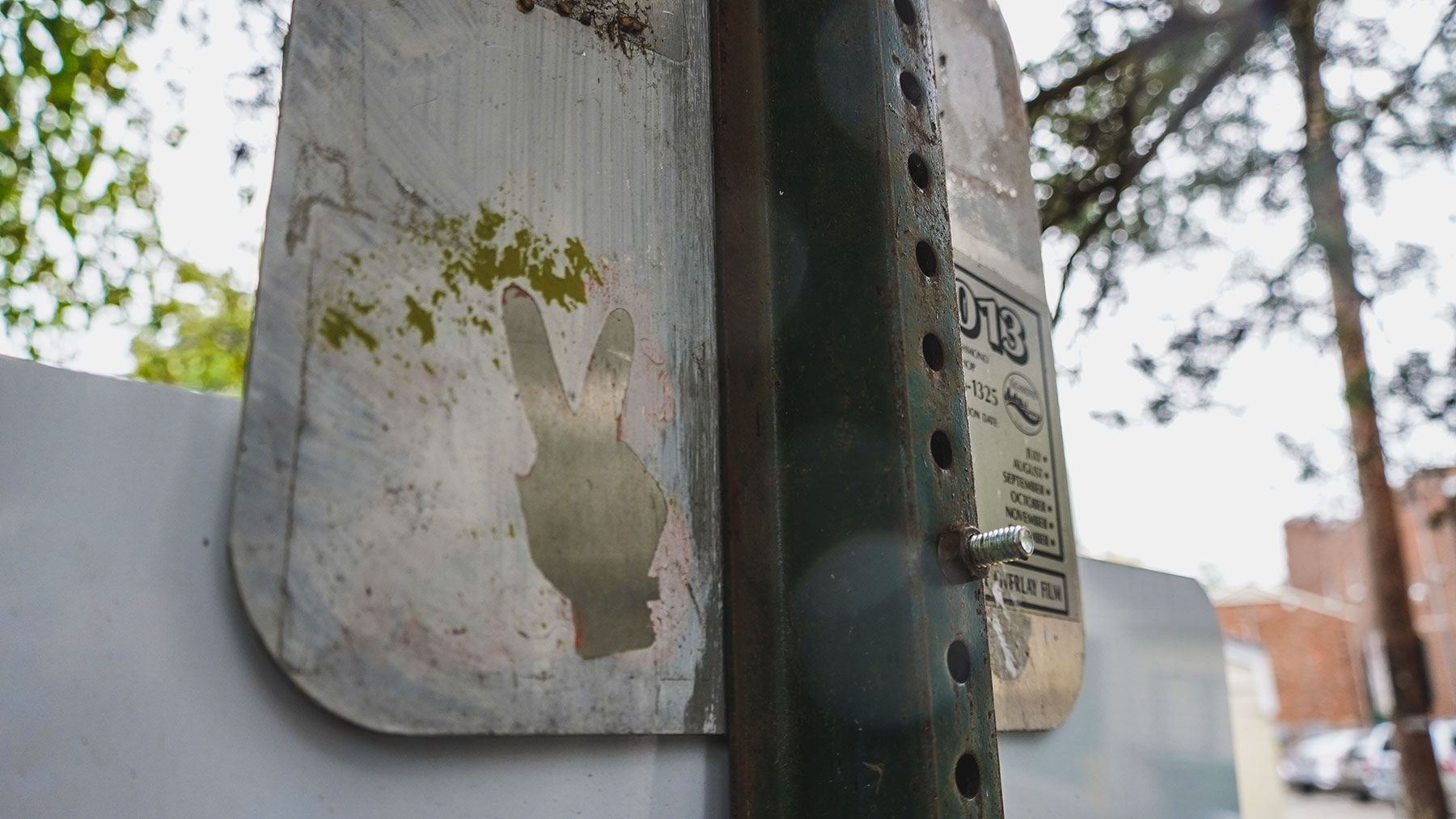 A sticker was placed on the sign, painted over, and removed. A 2013 Richmond sticker was placed on the sign, and a screw was replaced because it was getting weak.