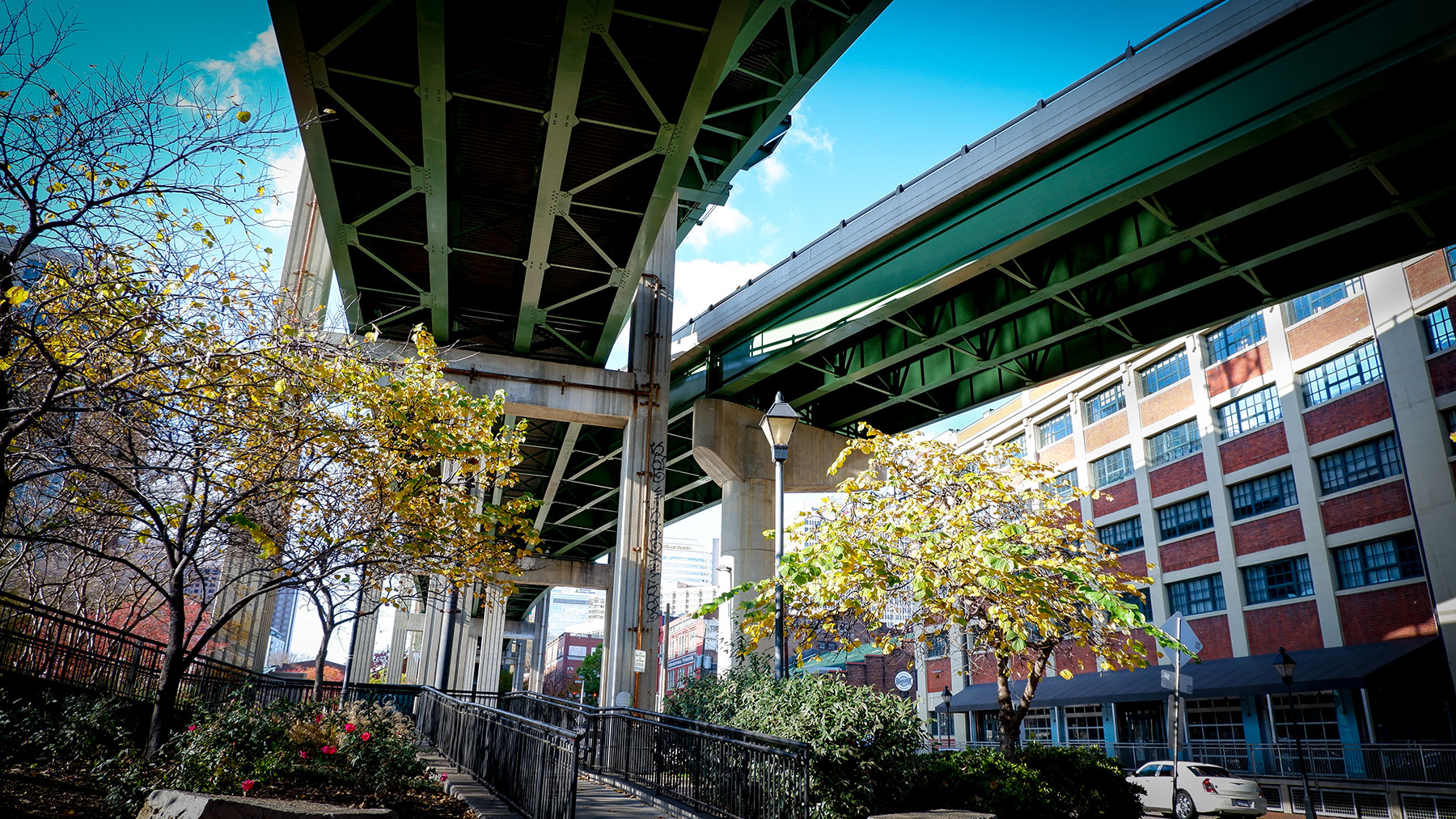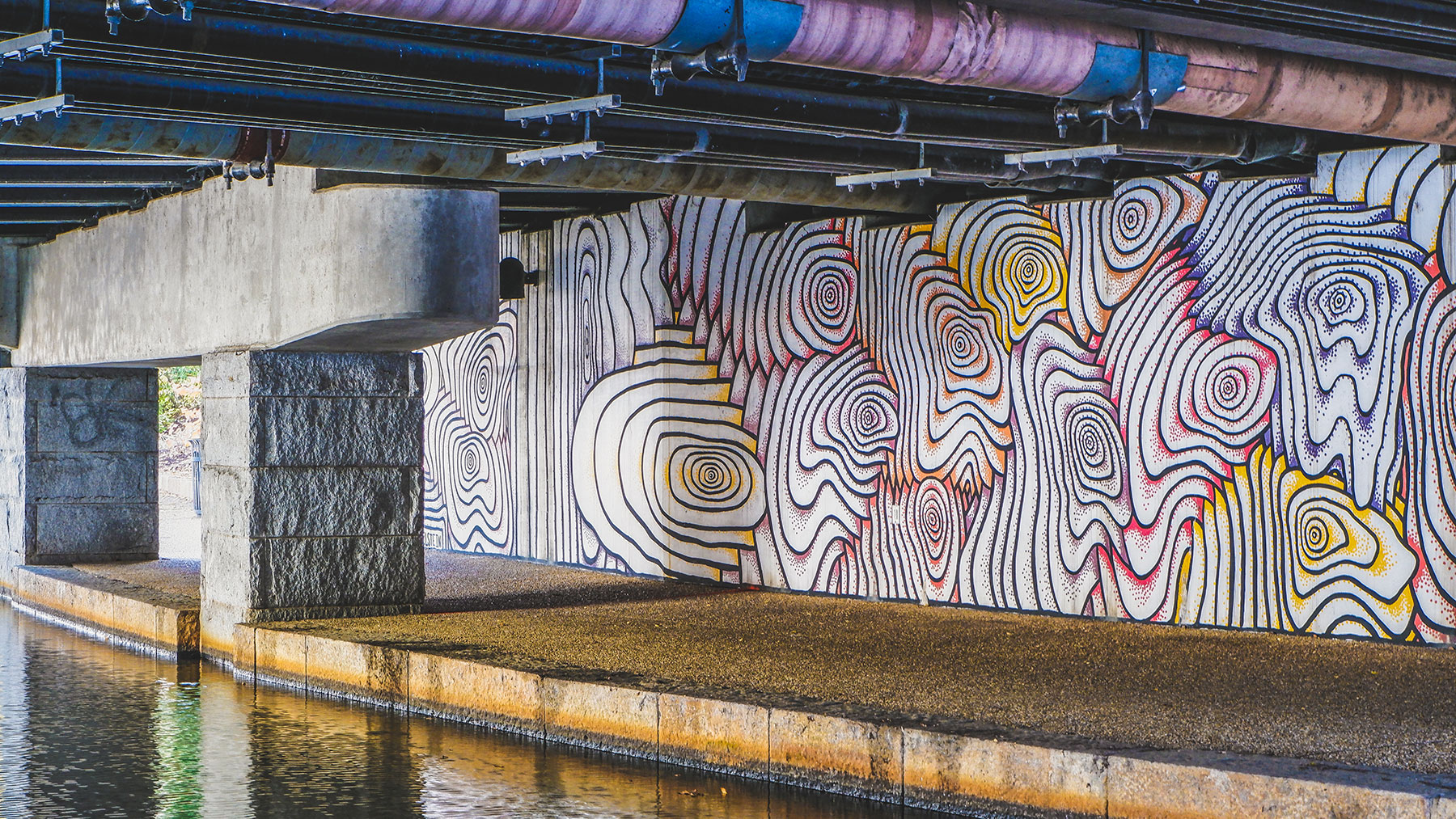 The mural looks natural and organic compared to the hard concrete and steel underpass.